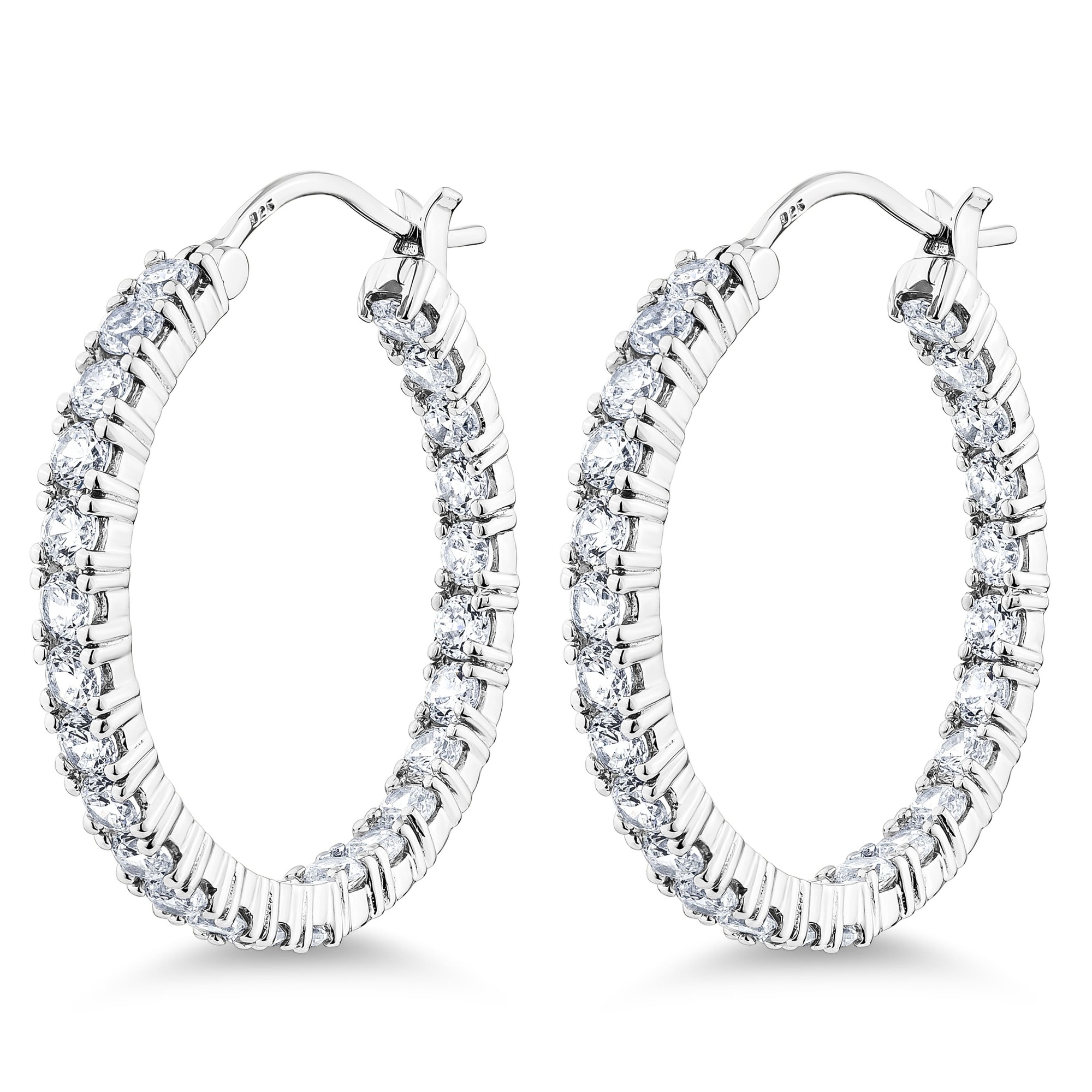 [woocommerce_currency_switcher_drop_down_box]The Double-Sided Hoop Earring showcases a 3mm brilliant round diamond simulant in an individual prong setting, crafted with rhodium-plated Sterling Silver 925. Available in classic sterling silver, 14K yellow gold, or rose gold plating, each hoop is designed with post and backing for secure wear, featuring stones on both sides for a radiant, modern look.