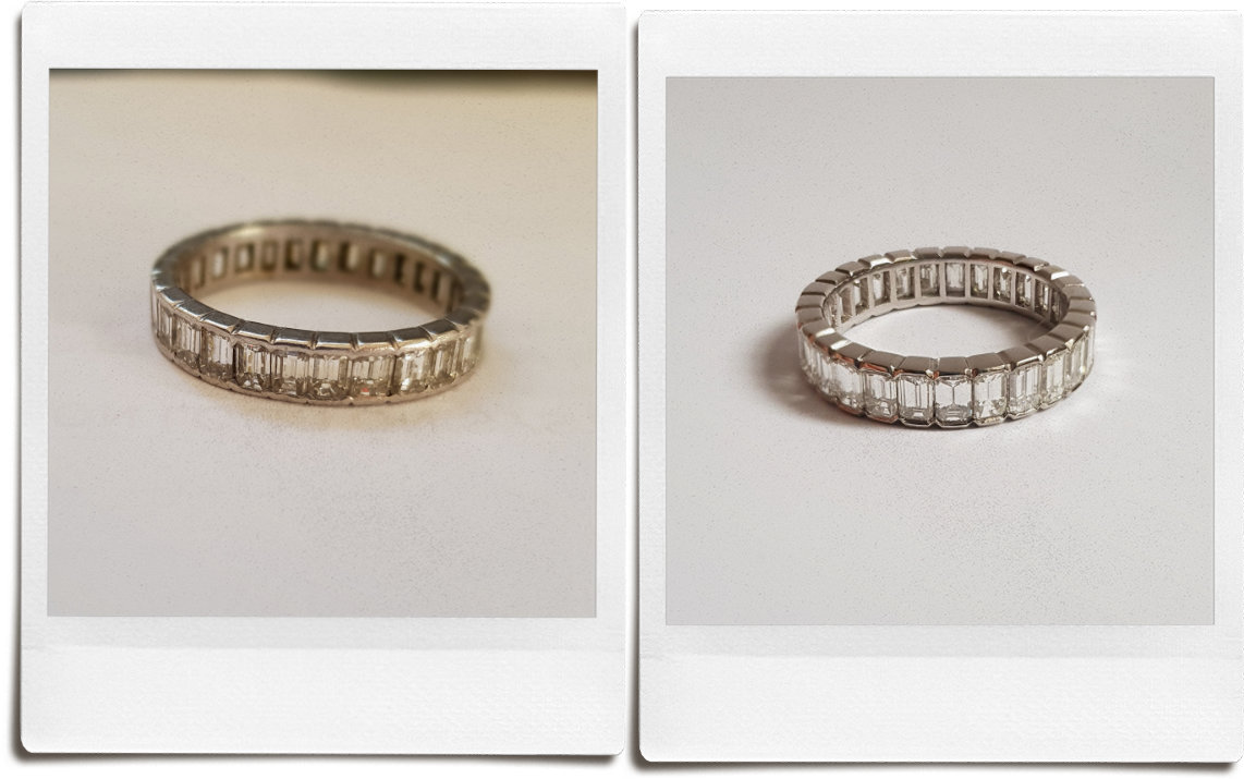 For the Eternity Ring above, the metal was worn in several places, and had a couple of cracks meaning there was a high risk diamonds were going to be lost. For a small area, we could probably have repaired the metal, but here, because there was so much wear, the goldsmith used the old metal to re-create the stone setting, adding additional platinum for strength. The ring is back to being worn daily.